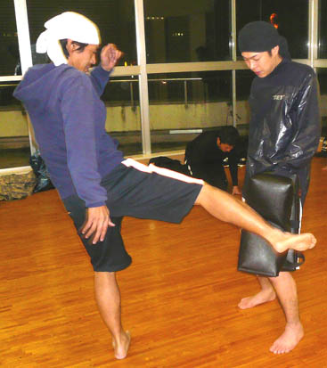 しばらく動いて、みんな準備が整ったら、太もものミットをつけて、蹴り感を取り戻してもらいます。モット強くー!と偉そうにしてるのはKAz(笑)。なんて言いながら、実は笑っていますが。。。笑 とにかく蹴りもパンチもフォームが美しいTさん。この日も徐々に体を慣らしていきました。早いんですよね、この人は。きっと、フォームがしっかりしているので、出す動きがスムーズになって、スピードに繋がっているんだと思います。ただ、ストレートを出す時、腰をもっと入れて肩が横顔につくくらい体を乗せると、もっと効き目あるストレートになると思います☆ みねさんのローキック。この日は、結構細かい事をいいましたねぇ~。カメラを持っていったので、その違いを画像で説明しながら、お伝えしました。この時にはだいぶいい感じに変化してきた後ですね。後は、もっと、骨盤を前に出して体を開くといいのでは無いでしょうか。ついでにいうと、この写真で判断するに、軸足がもっと返ってくるとさらにGoodでーす☆ただし、みねさんのこの蹴りの威力はたいしたもんです。打点をもう少し前にずらせば、膝は生けると思います。怖いので教えませんが。。。笑 O君のミドル。危ないです。笑 ミットで受けてても、痛いくらいのミドルキック。重い、というより、硬いんですよね、骨が。ミットを通り越して骨で殴られてる感じ。。あーやだやだ。。。笑 これ以上、強くならないでほしいのであまり言いたくありませんが、『軸足』を見てください。蹴った後に、この軸足が相手の方向に向く意識を持てば、より一層の威力が出ます。やだなぁ~これは。。。笑 最後に、KAzも多少、受けてもらいました。軽いスパーリングですが、皆さん、汗をかくどころか、かろうじて、体が温まる、程度だったのでしょうか。。。笑 それにしても、総評すると、週一回の稽古でよくもまぁ、ここまでみんな強くなったな、と思います。 今年の稽古修めは、こんな感じでした。 今回は、都合がつかずこれなかったメンバーも数名いましたが、みなさんそれぞれ上手になってこれた一年だったと思います。来年もとにかく無理をしないで(笑)、笑いながらも楽しくストレス発散できる部活に出来ればと思いますー。 年初めには、レガースを買って、少しガチ目のスパーリングもしていきましょうー。 追記:来週は部活の忘年会です。笑 | カレンダー