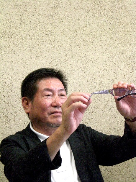 ↑アゲートが入っているサンプルをご覧になる巨匠 ご好評頂いているEE22916ですが、 そこに装着されているアゲートを輸入、染色、カットされている 巨匠が弊社をご訪問されました。 (遠いところ、ありがとうございます!) 様々な天然石を扱われている先生で、 以前、ご紹介させていただいたものは珊瑚瑪瑙といって インドネシアで取れたものだそうです。 今回のアゲートは・・・・ 原石の段階で、どの塊りがどんな風に色が浸透していくかを見極めて、 これぞ、と思われる天然石を染料に浸します。 日の当たらない場所で様子を見ながら約3ヶ月、染色するそうです。 その後、天然石を薄くスライスしていき(これぞ巨匠のテク!) 熱処理でその染料を定着させるそう。ただし、 ○○○℃~○○○℃までの間で定着させます。(秘) 600℃まで行くと天然石の模様もいれた染料も炭化してしまい、 全て透明になってしまうそう。 今回のEROSの石も様々な試験を経て、ここが最高点というところで 石の加工をしていただけたんだとか。 タンザナイト(タンザニア)の話や、 アフリカ←→インド間の天然石の貿易の話、 そして、今回、EROSでも使っているアゲートで ランプシェードを作成したら、数百万になっちゃったよ、 と、出てくる会話の内容が半端じゃないお人でした。 ぱっと見は怖いですねぇ~。 かなり、強面の先生でしたが、 『巨匠の手を見せてください!』 というと、手を隠しちゃうような、おちゃめな一面も 持ち合わせている方でした。