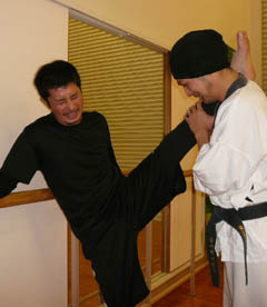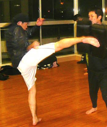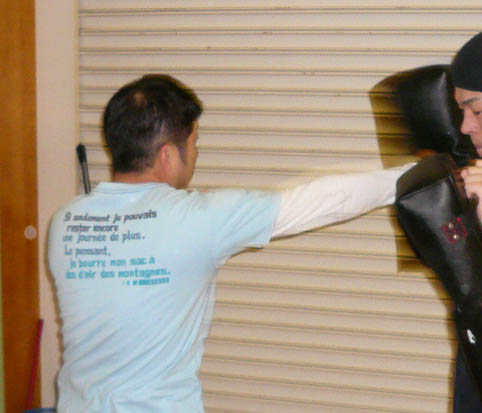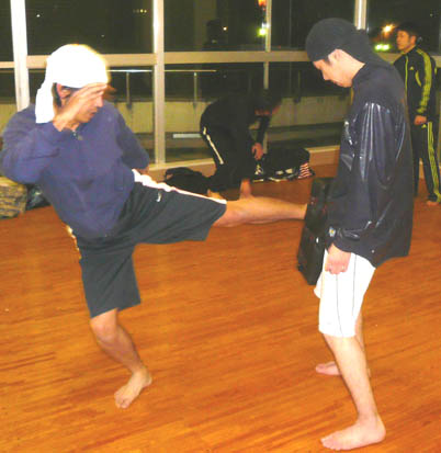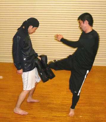しばらく動いて、みんな準備が整ったら、太もものミットをつけて、蹴り感を取り戻してもらいます。モット強くー!と偉そうにしてるのはKAz(笑)。なんて言いながら、実は笑っていますが。。。笑 とにかく蹴りもパンチもフォームが美しいTさん。この日も徐々に体を慣らしていきました。早いんですよね、この人は。きっと、フォームがしっかりしているので、出す動きがスムーズになって、スピードに繋がっているんだと思います。ただ、ストレートを出す時、腰をもっと入れて肩が横顔につくくらい体を乗せると、もっと効き目あるストレートになると思います☆ みねさんのローキック。この日は、結構細かい事をいいましたねぇ~。カメラを持っていったので、その違いを画像で説明しながら、お伝えしました。この時にはだいぶいい感じに変化してきた後ですね。後は、もっと、骨盤を前に出して体を開くといいのでは無いでしょうか。ついでにいうと、この写真で判断するに、軸足がもっと返ってくるとさらにGoodでーす☆ただし、みねさんのこの蹴りの威力はたいしたもんです。打点をもう少し前にずらせば、膝は生けると思います。怖いので教えませんが。。。笑 O君のミドル。危ないです。笑 ミットで受けてても、痛いくらいのミドルキック。重い、というより、硬いんですよね、骨が。ミットを通り越して骨で殴られてる感じ。。あーやだやだ。。。笑 これ以上、強くならないでほしいのであまり言いたくありませんが、『軸足』を見てください。蹴った後に、この軸足が相手の方向に向く意識を持てば、より一層の威力が出ます。やだなぁ~これは。。。笑 最後に、KAzも多少、受けてもらいました。軽いスパーリングですが、皆さん、汗をかくどころか、かろうじて、体が温まる、程度だったのでしょうか。。。笑 それにしても、総評すると、週一回の稽古でよくもまぁ、ここまでみんな強くなったな、と思います。 今年の稽古修めは、こんな感じでした。 今回は、都合がつかずこれなかったメンバーも数名いましたが、みなさんそれぞれ上手になってこれた一年だったと思います。来年もとにかく無理をしないで(笑)、笑いながらも楽しくストレス発散できる部活に出来ればと思いますー。 年初めには、レガースを買って、少しガチ目のスパーリングもしていきましょうー。 追記:来週は部活の忘年会です。笑 | カレンダー
