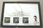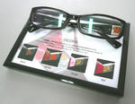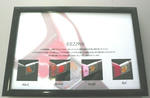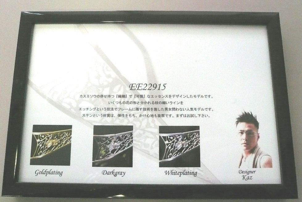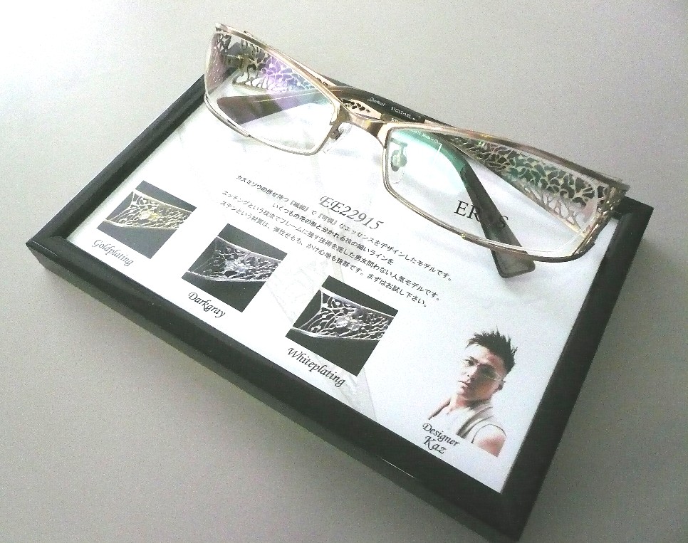 ご要望頂戴していた一枚置きディスプレーを簡単ですが、 作成してみました。 お店様によって、EROSの中でも 『このモデルを推したい!』と 思ってくださってるスタイルが異なるので、それが明確にわかる事と、 お薦め商品という事で、ユーザー様にもご好評だとか。 なかなか一枚ずつ置くディスプレイでいいものがない、という ご意見も過去に頂戴しておりましたので、 今回は簡単に作成できるディスプレイを考えてみました。 それは、『写真立』です。 市販されているフォトフレームの大きさに 写真と必要な文言を打ち込み、データを作成します。 上の方に眼鏡を一枚置けるくらいのスペースを考えながら。。 その次に 光沢紙(これが結構高い!)に印刷し、はめ込みます。 こんな感じ! 背景にはフレームの写真をアップにして、 透明度を上げてイメージを作りました。 上の方に眼鏡一枚分のスペースがありますので、 それぞれの紹介したい品番のフレームを置きます。 となります。 なかなかいい感じに仕上がったと思います。 注意点は、フォトフレームはガラスのものは やめたほうがいいかもしれません。