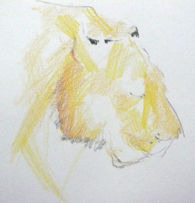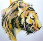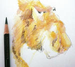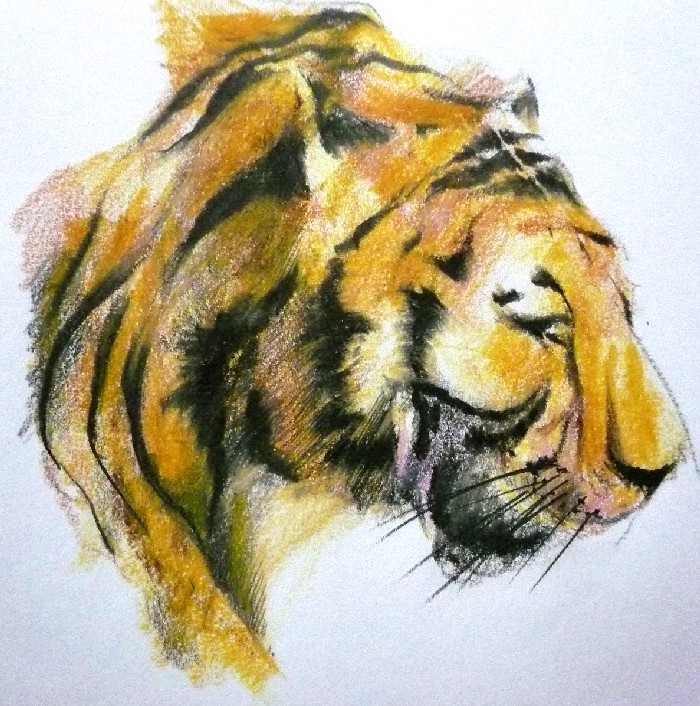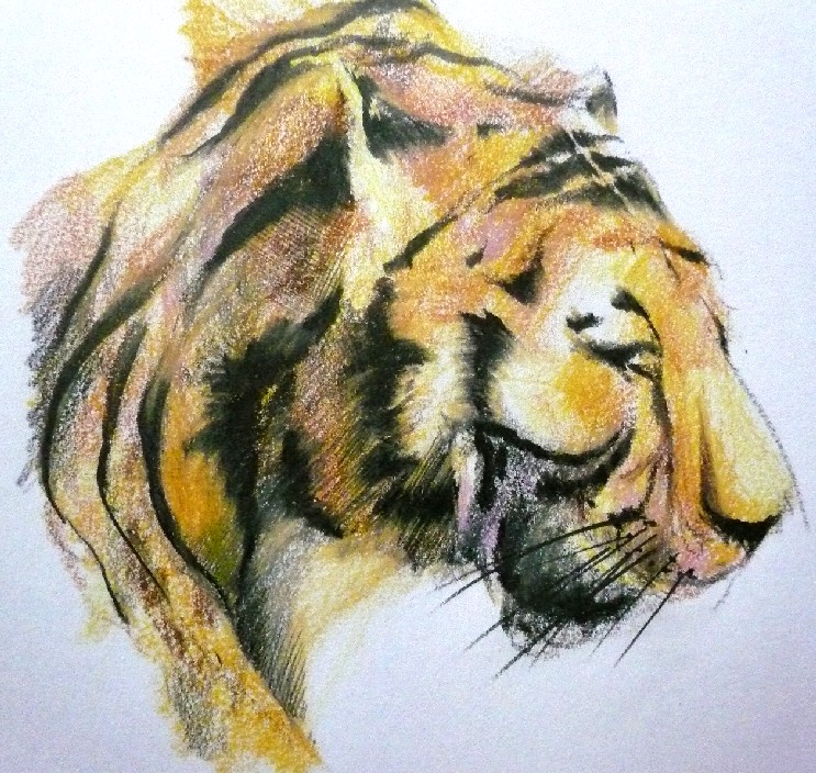 最終的には合成で眼鏡をかけさせるので、 正面見えだと眼鏡がわからないかも?という事で 念のため、横向きのトラも描いてみました。 先ほど、下描きを簡単に描いてから、 ぼわーんとしたベースの色を塗っていきます。 次に全体的に、もう少し色を塗るのと、 写真に写っていくダークグレーで、 顔と首の境目や、耳の影のところ等、 形態をもう少し整理しておきます。 先ほどと同じような手順で、鉛筆で模様を描いて、 薄い黄色で毛足のようなぼかしをつけていきます。 さっきの正面の絵よりも、横顔の方が毛の流れが見えやすいので、 『ぼかす範囲』を広げて描いてみました。 それから、黄色と黒だけで描いていると色相が乏しくなりがちなので、 ピンクを淡い紫の色鉛筆で、華やかさを加えてみました。 最後に、黄色(今回はホントにクロームイエロー)で 所々に色を加えて、彩度を高めて完成です。 ガオ!