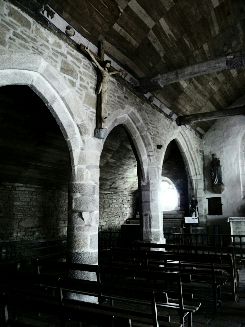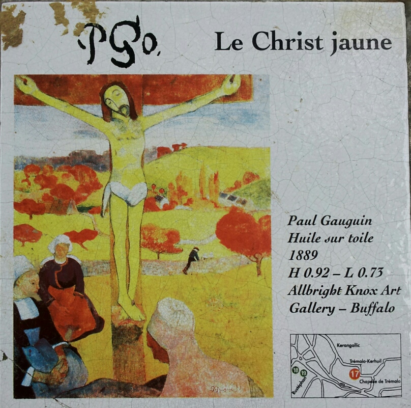 ここは、ゴーギャンがタヒチに 行く前に10年くらい住んでいたので 芸術の村、と言われています。 んー、と言ってもあまり、 ゴーギャンに直結するものが…。 売り絵のギャラリーは軒を連ねますが 彼の息吹を感じる何かは少ないです。 まー、タヒチの女っつー位なので ゴーギャンが開花する前。 リーマンしながらの画家か、 作家一筋で飯を食うかの 葛藤の地、だったかもしれません。 その村から車で10分程、 山を登って行くと、 『黄色いキリストの教会』があります。 例外なくここもひとけゼロ(笑)。 しかし、緑の大地と樹木に囲まれた 平原にポツリとあるこの教会の方が よっぽどゴーギャンの霊気を感じます。 見てください、 この黄色いキリストの顔(笑)。 あーた、もうちょっと真剣に 描きなさいよ、と言いたいとこですが… ここに掛かっているキリスト (写真 左手)とそっくり☆ 賛美歌無し。 パイプオルガン無し。 ステンドグラスも電気も無し。 感じられるのは、 差し込む光と、開いた扉の外で 聞こえる風の音だけ。 訴えかけられる、何かを感じました。