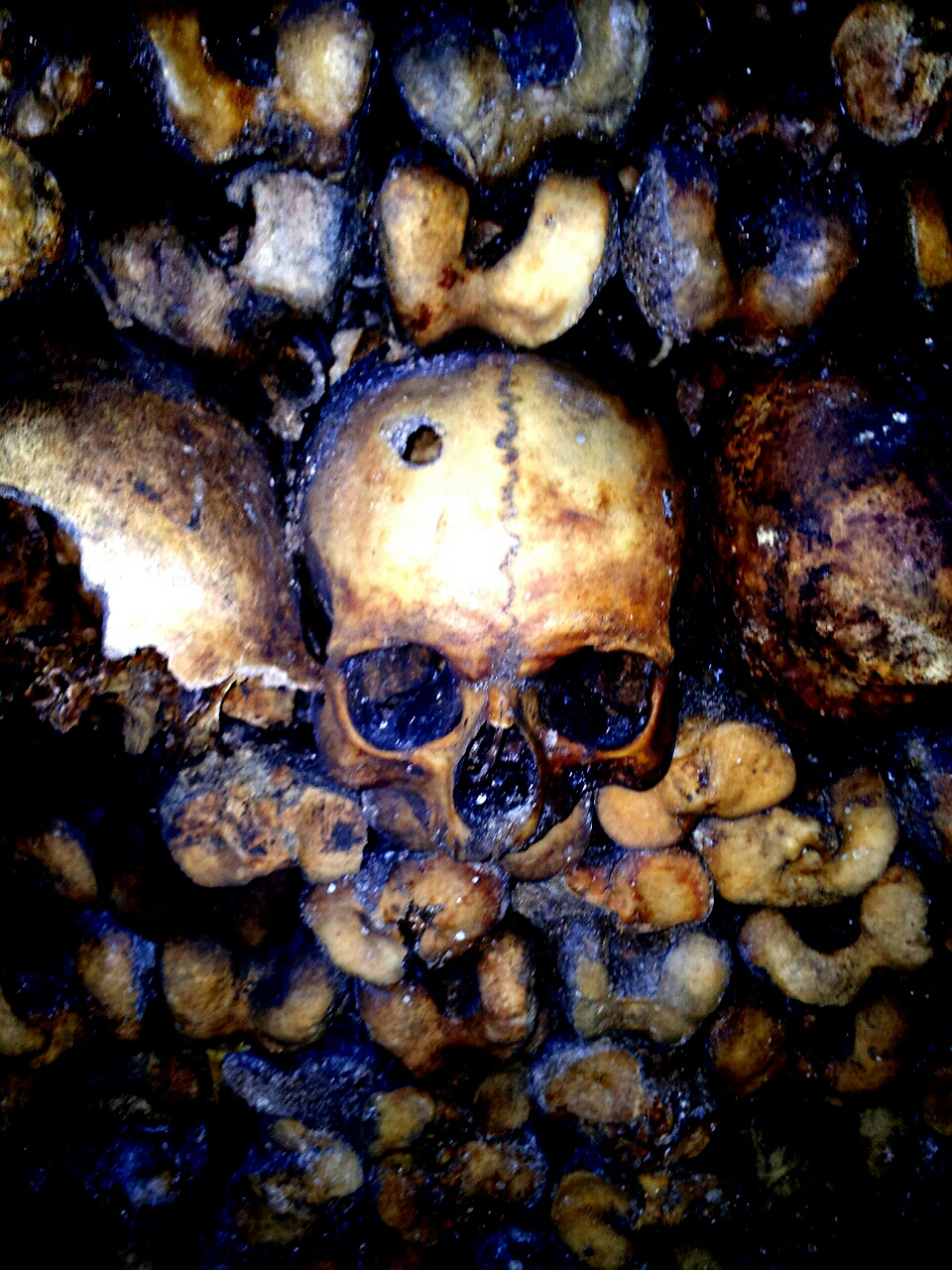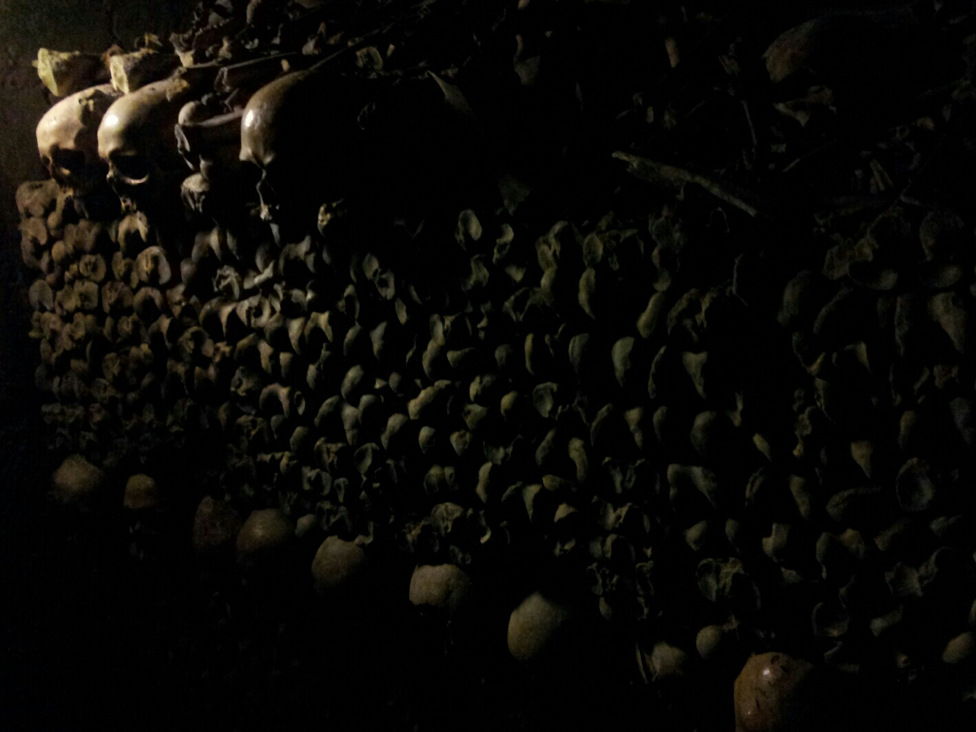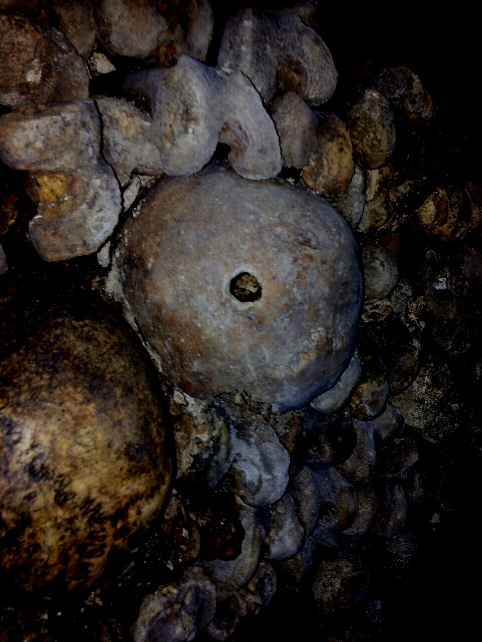違う行き先のご紹介。 怖いのグロいのが苦手な方は ここでご遠慮を。 以前から気になっていた場所へ 遂に足を踏み入れました。 カタコンブ。 昔、墓地の場所が不足したので そこに安置されていた約600万人分の 遺骨を地下墓地に移したそうな。 その距離、2キロ弱。 駅で言うと次の街までの面積の 全てが遺骨で埋め尽くされている、 と言う事になります。 これまで友人や知り合いがここ、 パリを訪ねてくれましたが、 まぁ、誰も一緒に来るわけが 無いのでその機会を 逃して来ましたがいよいよ到来デス。 入り口です。 なかなか重々しい空気に包まれてます。 中へ入ると直ぐに地下へ続く 螺旋階段が、、、。 これが結構深い。螺旋状の狭い 階段を降りているだけで目が回り そうでしたが、着いたらすぐに ひんやりとした空気に包まれた洞窟。 この距離が意外と長く、1キロ以上 あるそうな。 時々、前後に人がいなくなり 瞬間的に、道、間違ってないよな? と、思いながら、とにかく前進。 すると、突然現れたその入り口。 おびただしい数の人骨。 それがまたキレイに並んでるから 一瞬、普通の壁にも見えちゃう。 この写真、このライティングが 一番キレイに撮れたんじゃ? と思います。 これもなかなか。 この写真は、なんだか感じる。。 キチンと安らかに眠れて いれるように、だな、これは。 これは、いったい どういう亡くなり方をしたのかね。 これもね。 その昔、 今じや考えれない人生の 終焉を迎えた人がたくさんいる、 そんな事を感じました。 今の世の中は、また別の 恐ろしさがありますが。 このカタコンブについて、 モラルや価値観で語っている サイトやブログを見つけたので そういうコメントはあえて 控えます。 自分の素直な感想でいえば、 訴えかける威力はスゴイ。 これが人間か、 と言う、印象でした。 何よりもたくさんの意味を持つ、 何よりもこちらに向かって 肉薄してくる、 モチーフで例えればそんな感じです。 んー、自分の中ではまだ 生きたまま、捉えてるのかも しれません。 どこかに 『一人では行かないでください!』 なんて書いてたけど、 ホントそうかもね。 気持ちを鎮めに行ったけど そういうところじゃないな、 ここは。