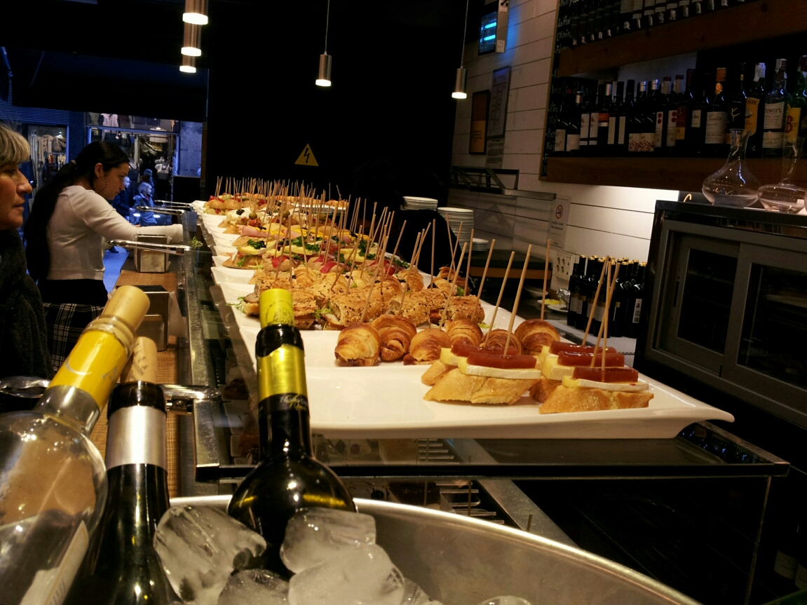 とにかく、食べた、飲んだ。 まずは、その金額。 今回は決して予算を振り返らない!(笑)と決めていたので 何でもいつでもとにかく、食べました。結果、常に胃もたれ(笑)。 コレはピンチョス! 串に刺さった具材がバゲットに 乗せられてカウンターに並べられる。 ブルスケッタのようなシンプルなモノもあればトンカツや魚が乗っている食事のようなボリュームがあるものもある。 気に入ったのはその単純なシステムと明瞭な会計システム。 この店は全てのピンチョスが1.7Euro。 そして、どこの店も勝手に入って 食べたいモノをカウンターから 持っていって食べたいだけ食べて帰る。 会計は串の数だけ!(笑) ぁ~この回転寿司的な会計方法、 とても親近感が湧きます。 中にはもはや、串刺しなぞ無視して 完全にタパス化している手羽先等も 途中から登場。 見ていると時々料理が入れ替わるので気の長い客は、新鮮な料理だけを選ぶ者も。 そんな気長な食事もスペインならでは!