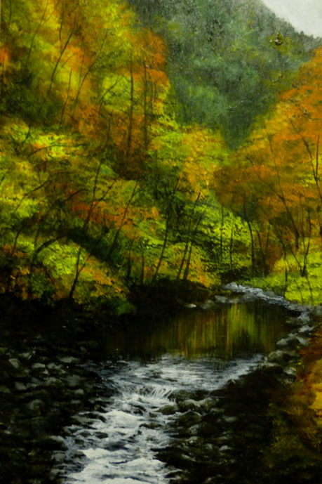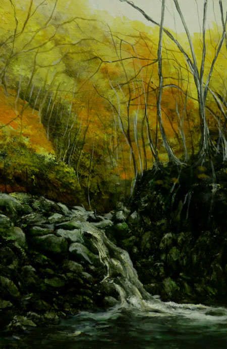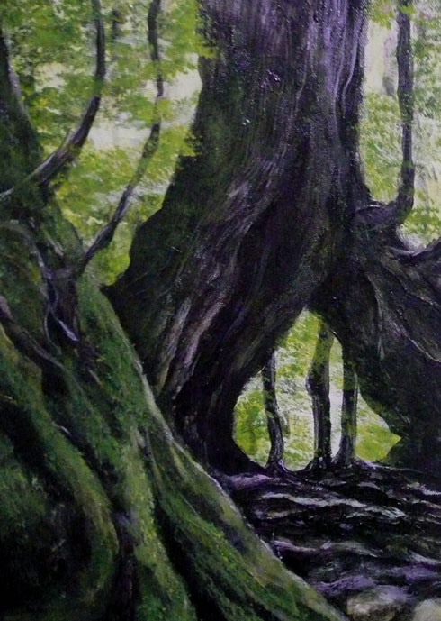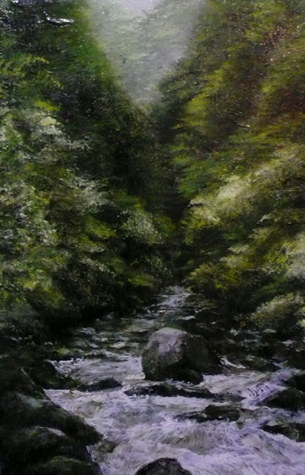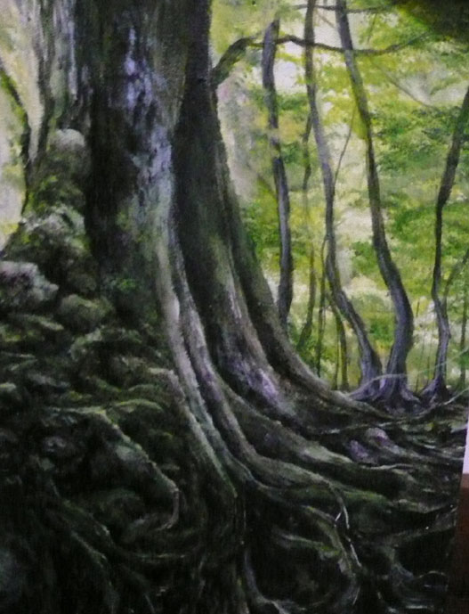 当初、手前の太い樹木はほぼ、黒で描いていました。真っ黒の物体の向こうに遠景が広がる、構図でみせるダイナミックな作品に、と思っていましたが、、、。いいのか悪いのかはわかりませんが、手前の樹木だってそんな単純なものではなく、複雑に根が絡み合い、その歴史が物語られています。という事で、またもや、完成した作品でしたが、再開しました。樹木左側のぼこぼこの表現なんかは、最初は潰していました。べたっと闇一色。でも、そうじゃないよなぁ~なんて自分なりに考えてみて・・・再表現してみたのですが。。。んーこの状態は自分にとってあまりいい傾向じゃないんですよねぇ。。。進化か、退化はまず、おいといて、こんな事考え始めると、また負の方向に制作意欲が働きそうです。こういう気持ちになり始めると、考えてる事全てが、負になり始めるし、表現そのものも、“それを表現する為”になりがちなんです。 そろそろ、気持ちを切り替えて、次のテーマに移行する時期なのかもしれませんねぇ~。 | カレンダー