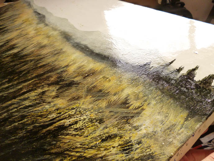 この時期は、デザインやEROSに関する仕事ではなく、別な仕事が発生する時期で、その準備や処理に追われていました。毎シーズン、この季節が恐ろしくてたまらないのですが、体調もそこそこ、倒れる事もなく、やーーーっと乗り切る事が出来そうです。ずいぶんと、ご無沙汰してしまいすみませんでした。 やっと、ブログも更新!と思いきや、またしても、EROS(眼鏡)の事でなく恐縮なのですが。。。。そんな中でも、製作は、日夜継続しておりました。この作品はもちろんまだ途中ですが・・・・。 『曽爾高原』というところです。なぜこの作品を描くに至ったのか、そのエピソードについては、いつか、そのタイミングが来たらお伝え致しますが・・・・。難しい!!! 全部が!!! 笑 結構、いろいろやったり重ねたり、試して試して描いている作品ですね。この微妙な感じの夕焼け、遠景の山、一面のススキ、すべてが自分の苦手分野なんです!(笑) こんな事を作家が書いていいのか?いいんです。苦手なもんは苦手なんです。 今回は、超速乾メディウム(クサ○べ製)と、テレピンにダンマル(樹脂)とシッカチーフ(速乾油)を入れて、乾かしながら描きます。この組み合わせがめっちゃクチャ乾燥が早いんです! 配分!? そんなものは、ノリで行きましょう!笑 ということで、乾くか乾ききる前に、次の色をのせていき、半分、ドライブラシのような技法で、描いています。(今は!笑) まだまだ、この先、どうなるかはわかりませんが、この後はスパッタリングで手前の表情を出しながら、未だに継続してます。結構、この作品はでかいので、朝になると、肩がギコギコ言ってます。。。
