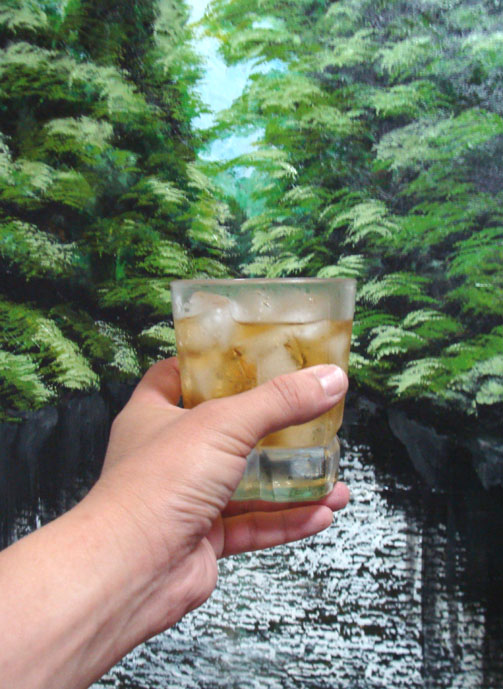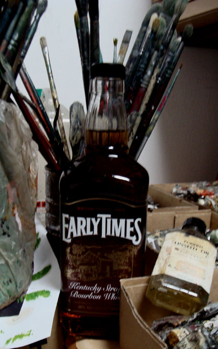本日の紹介は、【EarlyTimes】のブラウンラベル。んー?なんとなく、以前も紹介したような気がしますが。。。。ま、お許しください。このバーボンは、黄色いラベルの皆さまのご記憶にある(ない?笑)あのバーボンではなく、茶色のラベルで、ライ麦の%が、17%?18%?くらいで少し配分の変えたバーボンです。自分は、ウィスキーも香水も、家具も、全て、ウッドが好きです。だから、オークの匂い、スパイシーなこの香りが、自分の匂いのような気がします。(それくらい、受け入れ万全という前置きの上で!)よって、自分の疲れているとき、リラックスしたい時、この酒をいつしか飲むようになりました。モルトウィスキーももちろんいいです。だけど、気持ちや身体に優しいウィスキーも時にはいいですよね。バーボンだから、当然飲み方もロックで。 背景にあるのは、いま作ってる本作。まだまだ、緑や水面が初々しい、というか、恥ずかしい感じの表現ですが大丈夫。。。これからなのです。明日、明後日の完成に向けての祝勝会なので、今日はこのまま飲み続けます。 絵も、仕事も、人の事も 自分のことも全てやめ。 今日はひたすら飲む、そして寝ます。 さらに二日酔!みたいな。。。笑 この状態、アトリエの中で、筆や絵具に酒が混ざり始まると、非常に、まずい状況ですね。笑 来週から、きちんと酒はカウンターに戻します。でも、こんな風に、自分の筆や絵具に囲まれながら、好きな音楽を聴きながら、好きな酒を飲む、実は幸せな事ですよね。実際のところ、意外とコンパクトなんですが(笑)、今晩、とてもリラックスできています。来週から、また頑張ります☆