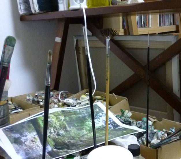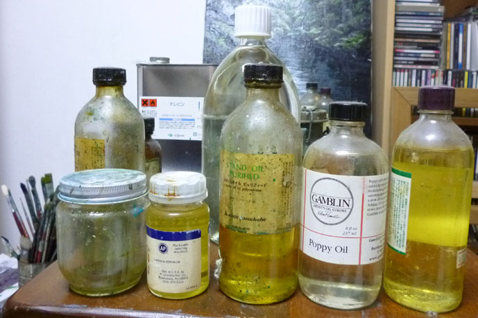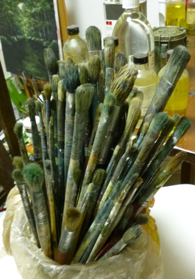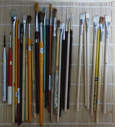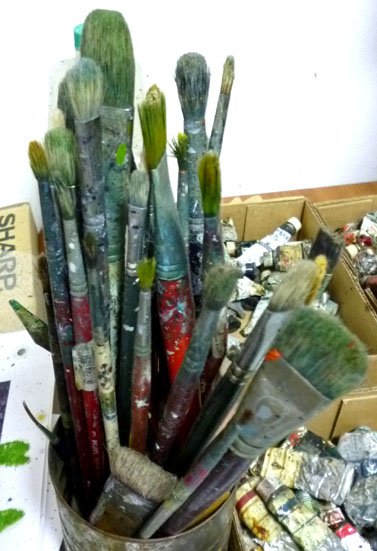 ついでに紹介すると、こちらはKAzの油彩用の筆ですね。一番左の写真はいざという時のストックの筆。実はここにはほとんど使っていない筆もあるのですが、全て合わせて40本ほど入っています。整理しなあかんですね。続いて、真ん中は、ここ最近、結構使い道いいんじゃぁねーの、と思ってる筆、ナイフが20本くらい。毎回マストな筆達ではないのですが、コンスタントに登場してくる筆です。一番右のピンピン突っ立ってる筆はまさに現在進行中の証(笑)。6~8本くらいこんな状態の筆がありますね。塗り方、描き方と、色分けしながら使い分けます。その方法はあまり面白くないので、ここでは割愛します。(笑)