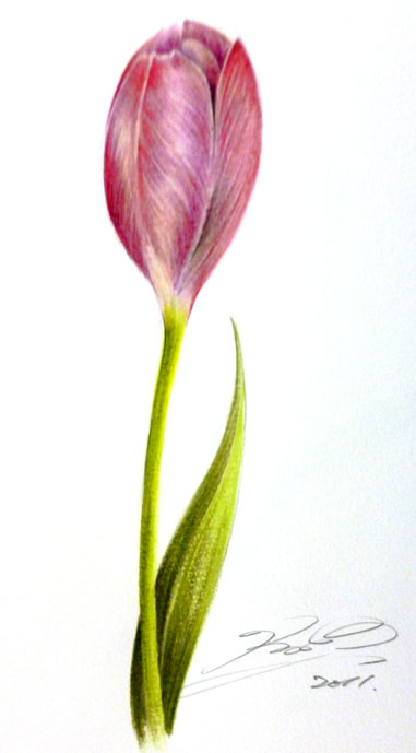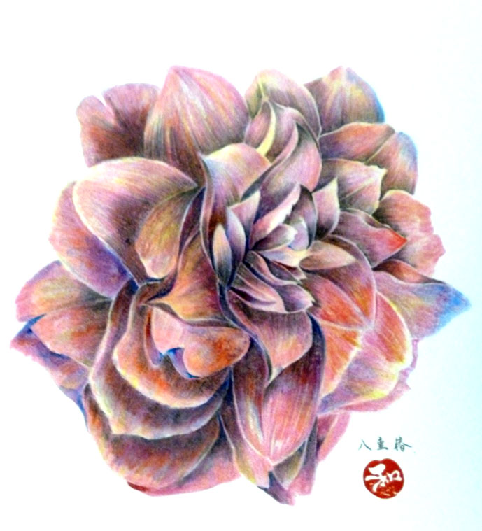 最新作のいくつかをご紹介しまーっす。 先日、あるところに出かけた時に見つけた花。八重椿だと思います。柔らかさや優しさを表現したい、それからどことなく、『和』を表現しようと思った作品でした。 もう完成!と何度も筆をおいた作品でしたが、結局、もう少し、もう少しと自分の思うように筆を進めるとなんとなく『洋』なイメージになりました。でもここで感じたのは、そうそう、自分らしく、自分の表現で、という事でした。イメージを持つのもいいけど、一番大切なのは、狙う、事じゃぁなくて自分の感じた自分らしさを入れる事の方が大切なんですねぇ~。ほんとの印象はもう少し、優しい感じです。笑 一右の花、EROSの1stでもモチーフになった“カラー”という花です。 久々に描きましたが、以前の描き方、感じ方と違う感情を入れたかったです。 描き慣れている分、好きな花だけに、自分にしかできない表現、コントラスト、強さや激しさに加えて色っぽさも表現したいと、描いてみました☆