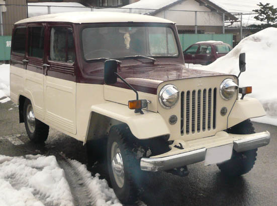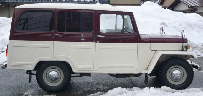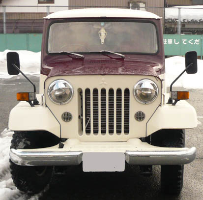 なんとKAzと同い年の車です。前列3人乗り、後部座席も3人乗りのベンチコラムシートです。通称ベンコラと言われるこの車はんーーハンドルの横っちょにシフトレバーが出ている昔のタクシーとか、バスと一緒です。 (で、イメージ、通じますかね??)ガコンガコンと言いながらギアを変えていくあのタイプです。かんたーんに説明すると、もともと、このJEEPっていうのは、ウィリス社というJEEPの会社があって、当時の朝鮮動乱において、アメリカで易いJEEPが必要だ!ってなわけで日本で部品を取り入れて、日本で組み立てた事から始まったようです。(ノックダウン生産っつーらしいです) その3年後、正式に、日本、三菱JEEPがライセンスとして、生産と販売が締結されいろんな形のJEEPが作られるようになったとか。(といっても、興味の無い人には同じ形に見える人もいるかもしれませんが。。) サニトラ、クラウン、セドグロY30、デボネアも好きなのですが、どこでも行ける、ぶっ壊れても簡単に治せる、そもそも壊れにくい、なんていう頑丈さも求める自分からすれば、これが理想的な一台になります。これまでは屋根が無い幌のJEEPで、夏になると幌を全開ににして、前のガラスも倒して、注目を集める!乗り方をして ましたが、少し大人になったので、屋根がある(笑)JEEPにしてみました。この年式で、この程度はなかなか無いと思います。探すと結構、あるのですが、ボロボロなんです。 『これは乗る車じゃねぇよ。博物館もってった方がいい』 とほめられました。〝あーそー。〟と言われてしまいそうですが、自分にとっては、そうとう嬉しいですね。気持ちが悪いですが。。笑これから、長年の夢だったこの車とは、出来るだけ、長い間、一緒に歩んでいきたいと思いますね。こんなにきれいなJ38がこの世に残ってて、自分のところにきてくれて本当に幸せですね。この写真にある、ライトのバイザーのみ、ちょこっといじりました。たれ目ちゃんで可愛いでしょ。あまり攻撃的な印象にはしたくなかったので。基本的には、この先もノーマルのままで行こうと思います。 乗り心地=尻がいたい、シートがギシギシ言う。 燃費 =気にしてないですが、多分、3,4km。 シフト =四速。 いやぁ~、素敵な車だわ。。かっこいい。色男だ。 実は、去年の12月から来てくれたのですが、 なかなかこんな写真を取る暇がなく、 毎日雪ばかりだったので、ご報告が遅れました。。。☆