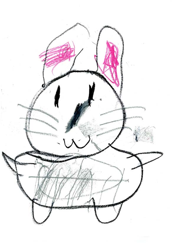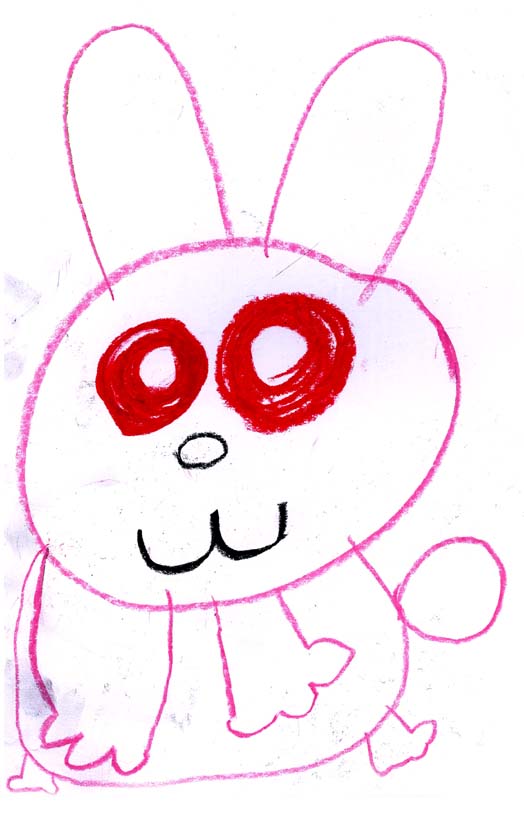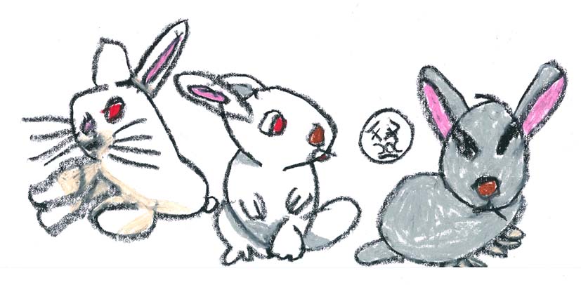 思えば2年も続いています。 最初の頃は、消火器でやらかしちゃったり、一人も席についてなかったりと大変でしたが、こうしてみると一人一人、それぞれの可能性が見えてきたり、その子の進化が伺えます。ちょっと前の教室ですが、来年の干支の絵を描かせてみましたー。 Y君のウサギの絵。 この子は自閉症。ただ、ただ、自分の気分のまま、絵を描いたり、騒いだり。それに飽きたら全く反応しなくなっちゃう状態でしたが、ここ最近はキチンと、意思疎通、こっちの言い分も聞いてくれるようになってきて、今回もウサギの絵を完成することができました。 この子もほーんとにかわいい子。手の力が足りないせいか、すぐに疲れちゃう状態でしたが、キチンと最後までかけるようになりましたー。笑ってる。 自閉症でハイテンション。それでいて、弁が立って強気。会話も出来て口が悪くて攻撃的。そんな彼だから、いつしか、こっちも普通に怒っちゃうし、会話もしちゃう。ふと見ると、目に涙が浮かんでたりするかわいい子。ふと、あぁ、子供なんだよな、って、こっちが学ばされる子です。 他にもまだいるのですが、この子達のウサギの絵ーは、先日、先輩からもらったプリンターを使って、自宅で年賀状を作ってやろうかと思います。なかなか素敵なプレゼントだと、我ながら思います。 なんで、こんな事を書くか。すごいとか、上手だとか、そうじゃなくて。。 自分の思い通りにならなくても、繰り返し、彼等は解決しよう、向上しようという気持ちが働いている。うまく描けなくたって、うまく描けたって、それが終わればまたすぐに次の課題、問題へ、その意識が移る。それだけ、真剣に生きているって事なんだと思います。無意識のうちに生きる事、生活することへの執念を持って活動しているんだな、と思います。KAzが知的児童の教室で絵を教えたりする度に、あぁ~おれもやらなくちゃな、って内心、励まされたりします。だからこそ、彼等に会いにいけるし、彼等から学ぼう、って思える。最初は、うまくさせよう、そつなくこなせれば、いいんじゃないか、って思ってたけど、いつしか、そう思えるようになりました。 彼らは無条件で、物事を完成させる。そして、だれのせいにする事もなく、 自分で悩み、自分で解決し、そのときできた結果を等身大と見なして受け入れて それを繰り返す事によって、少しずつだけど、前進していく。 口を開けば周囲のせいにするやつ。 景気がどう、周囲がどう、あの時はどう、あいつはこう。 何かのせいにばかりしてるやつ。 思い通りにならないなら、自分で動け! ビジョンを見るなら自分で切り開け!