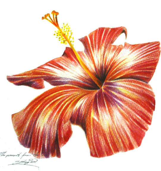 花の絵を描く事が多かったような気がします。 その流れでこの連休は製作活動に使い、 そして、そのモチーフを自分の描きたいモノに 決めました。 今回のモチーフはハイビスカス。 そして、このモチーフは、障害者施設の方々にも 描いていただき、同じ時間に製作したものです。 光源を強く意識して、艶感とコントラストをあげて 表現してみました。 作りもののように綺麗だったので、作品にした時にも、 より作りもののような美しさ、発色の表現に 挑戦してみましたー。 それにしても、色鉛筆でここまで強く塗ると、 結構大変な作業で、手首がガタガタしてきちゃいます。。。 腱鞘炎になるのは、時間の問題かと・・・・・アハハ