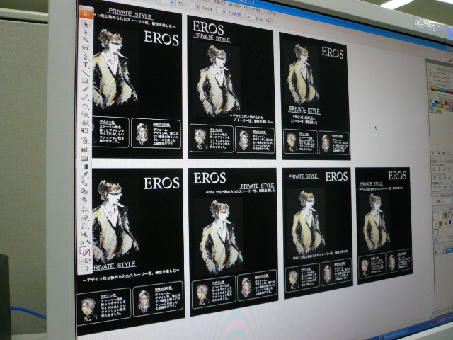 EROSはリクエストや願いに応える事を売りにしているブランドで、そのイメージやビジュアルも自分達でつくります。今晩は、そのディスプレイを一部作成していました。それらの工具や道具など、ほとんどのモノがKAzの机に揃っています。みんなおのおの仕事が始まると、それぞれ必要な道具をそこから持って行って使います。 どーも、ボスは、デザインカッターとメタル付きの定規を 日曜日にダイソーに買いに行ったらしく。 (あの・・週末くらいは仕事わすれましょうね。。。笑) その性能に相当感動しているようで、、、。 『・・・・・っこのカッター、ほんまにすごいわ。。。』 『・・・・ははぁぁ、、、定規んとこの金属に這わせて・・・・』 『・・・・・ダイソー、ほんまにすごいわ、こんなんあれば、って思ったらほんまに・・・・』 ほんっとに感動しているようでした。 そして、YUとの後ろ姿をUPしようと思い、写真を撮ったら、 『ブログ載せたらあかんでぇ! こういうのは主張せなあかんのや! 載せんなら、これにしぃや、これに!』 と、撮った写真がこのデザインカッターと、メタル付き定規でしたぁ~。 しかしその手さばきが、そうとう慣れているらしく、シャーシャー切っていました。笑 ちなみに、載せたらあかんで!!!と 怒られた写真がこれです。笑 ↓↓↓ 勝手にのせまーす♪ (若干びびりながらの掲載です☆)