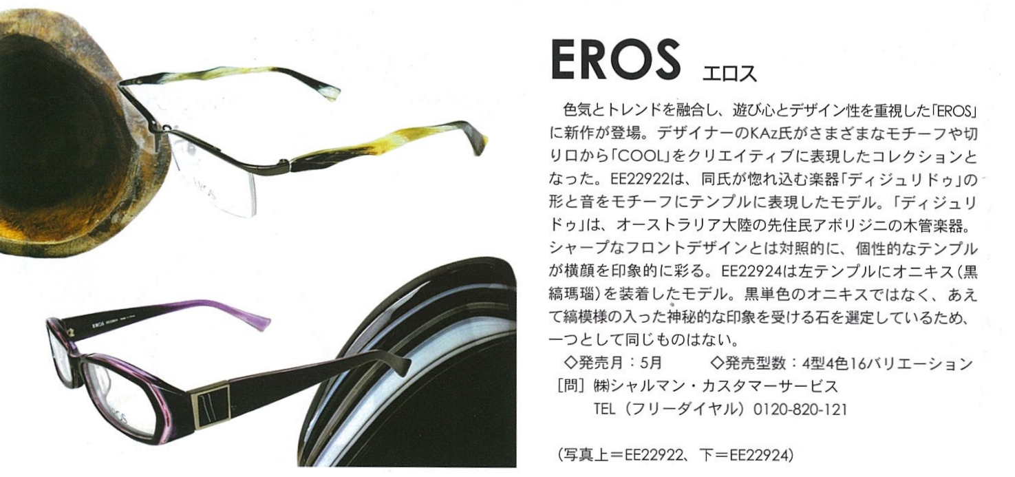 申し訳ございません。 まともなメガネのお話でございます。笑 やっと、EROSというメガネブランドらしいお話が できる感じになってまいりました。先日、業界誌の『眼鏡』にEROSを掲載して頂き、その中でも、ひときわ目立っていたのがEROS。 こちらが、掲載した写真なのですが、これまで、この業界誌では、フレームだけのショットが多く掲載されており、非常にクリーンで見やすく、親切なビジュアルが中心でした。 反面、我々、EROSチームからは、いやいや、EROSはフレームだけじゃなくて、ストーリーを感じてもらってこそ、EROSの良さを最大限に分かってもらえる、そのためにはモチーフも一緒に写さなきゃ!と、ちょと無理難題をボスから頂戴し(笑)、YUに作ってもらったのがこの写真。 そのまま掲載していただき、本当にありがとうございました。他のブランドがいろんな工夫をし始めたら、EROSの真似だね!なんて、話していますが、何かしら、弊社だけで無く、業界そのものを活気づける活動がこれから、続けていければいいかな、と思います。