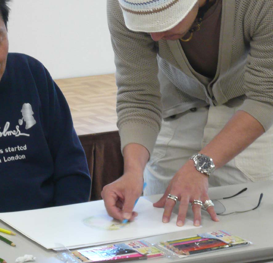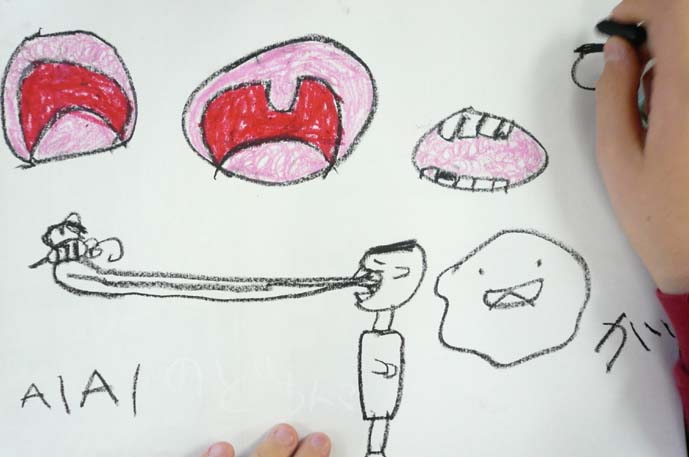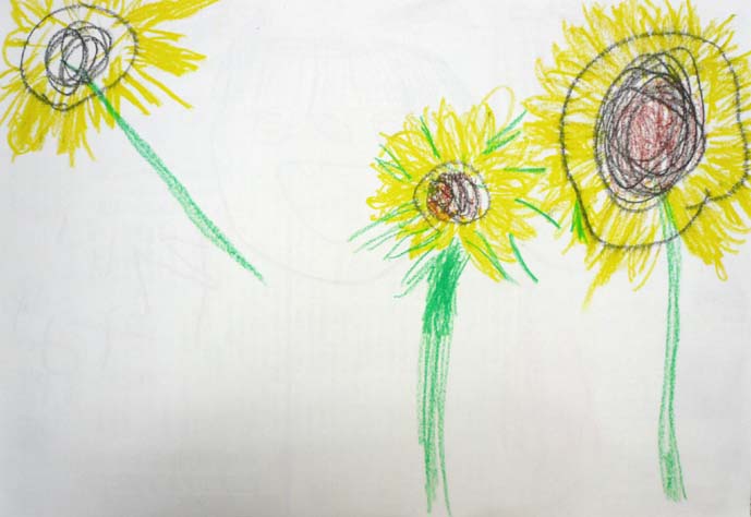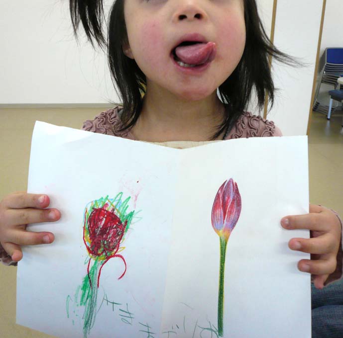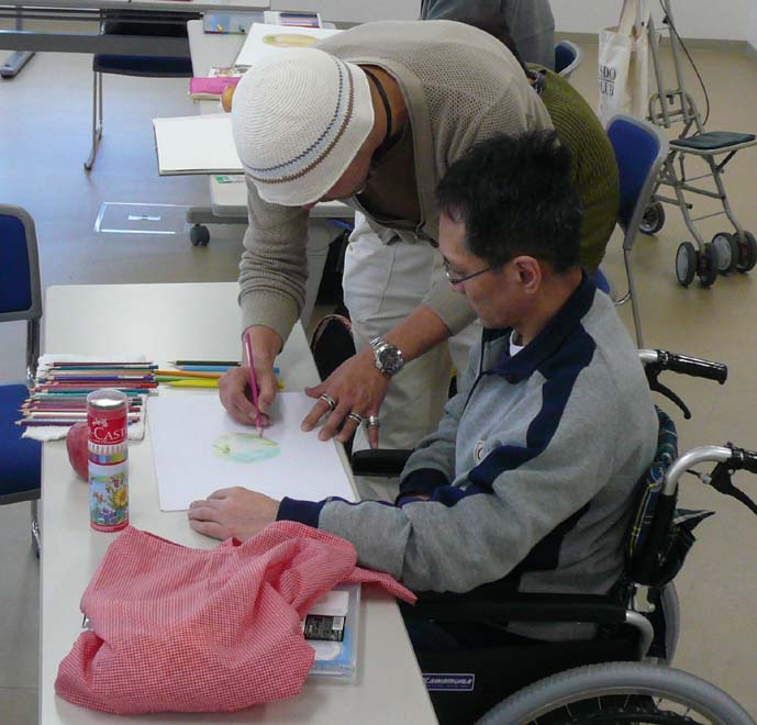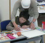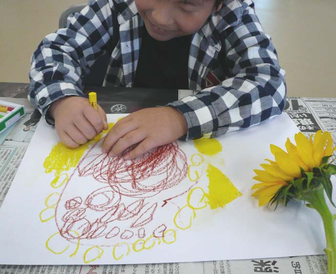 今日は、午前中が身体障害者クラスのボランティア、 午後が知的障害児童のボランティアでした。 どちらも久々でしたが、充実しました。 午前------------------------------------------- 先日ご紹介したリンゴを使ってみました。 早速、陰影、色見、デッサンと色鉛筆の違い等を 簡単にお伝えしながら、描き始めてみました。 色見、ベースの色の有無の違いを実際に 描いてみて伝えます。横にあるのは先日のリンゴの絵です。 結構大きいでしょ。。。。。 『描き方』も大切ですが、ストロークや、タッチ、 鉛筆への力の入れ具合も結構、大切なんですよね。 これはさすがに口では伝えにくいので、実際に 手を握って伝えました。 あーなるほどなるほどーなんて言ってくれてました。 ベースの色もどんどん塗っていきます。 ちょーーっとだけお手伝いもさせていただきました。 Tさんも今日は、新しい色鉛筆で挑戦してもらいましたが、 なかなかいい感じでしたねぇ~。 午後-------------------------------------------- 午後は子供の知的障害のクラス。 みんなかわいい子達ばっかりです。 彼らには花を描かせようと思い、 花屋に行ったらタイムサービス?で 少し安くしてくれました。(ラッキ-でした!) という事で、 うちにも買って来て生けちゃいました。(笑) バラも綺麗だったので、ついでに買っちゃいました。(笑) 会計終わった後に、家のお隣のおばあちゃん、 一人で歩いてたの思いだして、それもついでに 買っちゃいました。(喜んでましたー!) という事で、子供たちのモチーフのヒマワリとを合わせると、 とんでもない花束になってしまいました。。。。笑 早速午後の子供たち・・・・・・ 買っていったヒマワリが相当気にいってくれたのか、 一生懸命描いてくれました。この子、本当は感情のコントロールが 難しいはずの子なんですが、 僕にはめちゃめちゃ優しくしてくれるんですよね。 ヒマワリが似合ってた!今までで一番長い時間、 集中してくれました。おつかれさま☆ ヒマワリの花びらをちぎって貼ってる子もいました。 ママに軽く叱られてはいましたが、これってコラージュですよね。 立派な製作意識が芽生えています☆ この子は空を飛ぶヒマワリを描いてくれましたー。 この子も無口な女の子なんですが、KAzの顔を見ると、 ニコーーーって抱きついて来てくれる可愛い子。 しかし・・・・今日、抱っこしたら、相当重くなってました。。。 うまいもん食べ過ぎやな。 ヒマワリじゃなくて他の花がいい! と言われたので、チューリップを描いて渡したら、 ちゃーんと描いてくれました。 些細なこういうコミュニケーションが実は大きな進歩の 前触れだったりするんですよねぇ~。 自閉症のこの子には、しばらく全く無視されていましたね。(笑) 鼻水はひっかけられるわ、つばは吐かれて、髪の毛を引っ張られて。。 今日も、一見、まったくヒマワリと関係ない絵を 描いているようですが・・・・ 最後に描いている右上のマル・・・・ 実はヒマワリでした。。。かわいいなコイツ!!☆ そんなこんなで今日は終わり、もーーーーヘトヘトです。 充実の一日でした。。。。