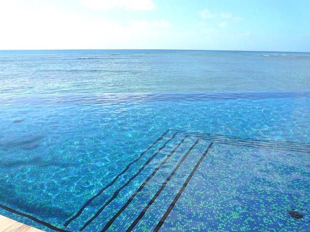 ホテルの中をうろうろしました。 今回は仕事の事は一切考えないと決めて旅行に来ましたが、、、 さっそく見つけてしまいました。 ホテルのロビーの透かしの壁がかっこいい模様で作られていました。 テンプルの抜きにしたらどうだろう、 フロントの柄にしたらどうだろう、 なんてじろじろ見てたら 『It'a Waikiki!!!』 と声をかけられました。 なるほど。。。 その後フラフラして、外に出てみると・・・ 目の前に海! と思いきや、目の前にあったのは海と繋がってみえる 屋外のプールでしたー。 気持ちのいい風景です。 (ここのホテルはシェラトンワイキキですー) 夜になるとこのプールはライトアップされて とてもキレイです。