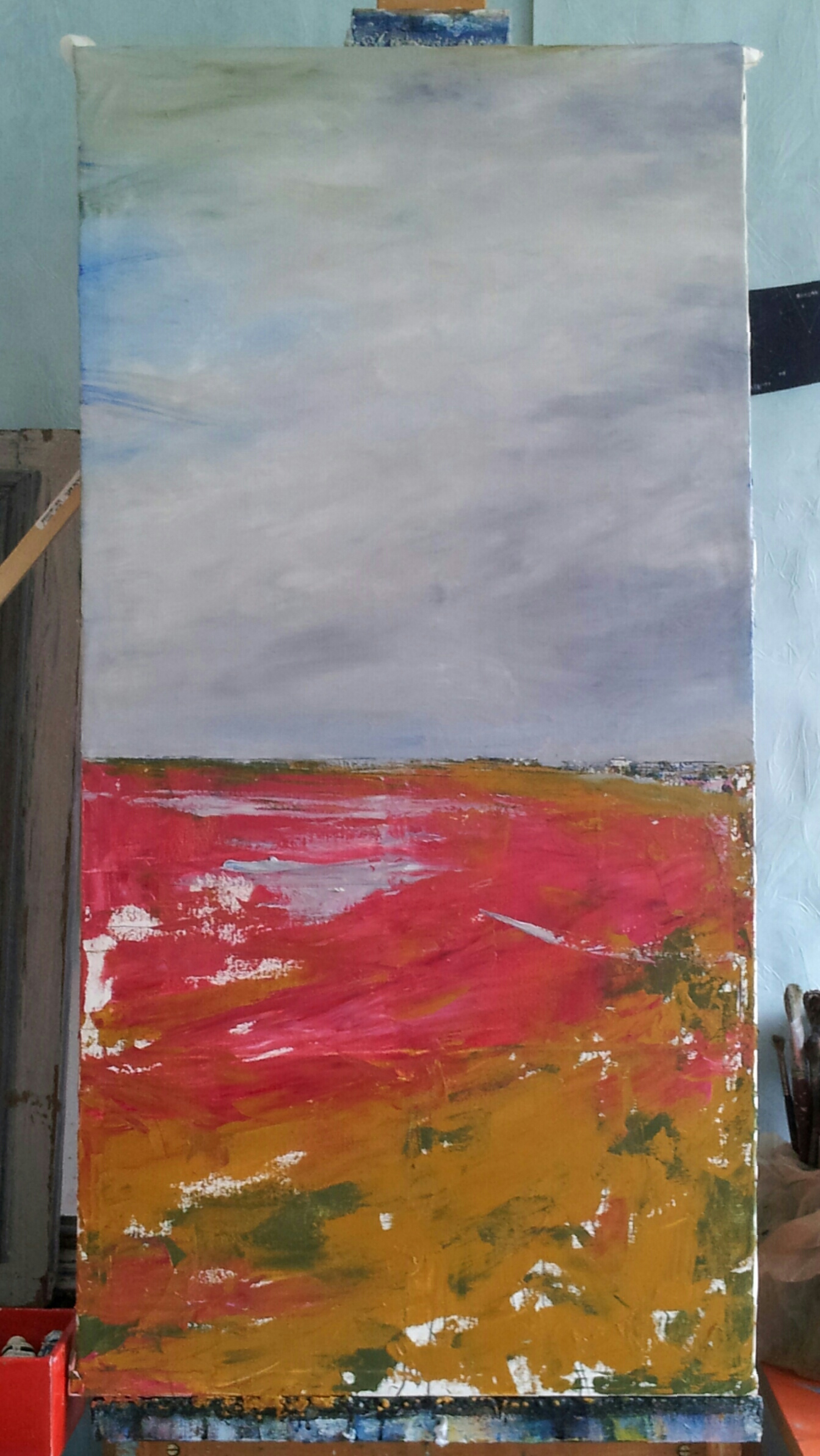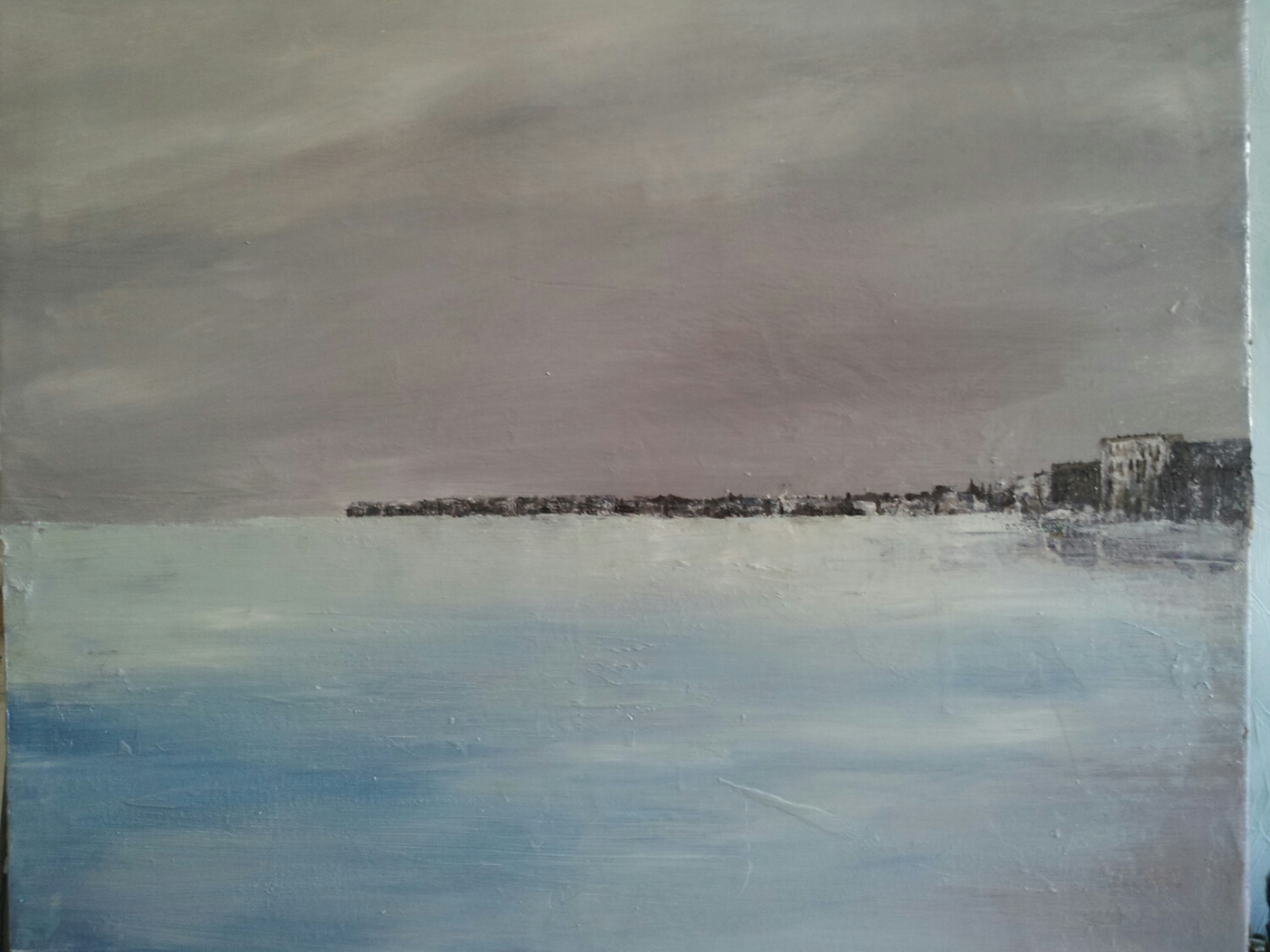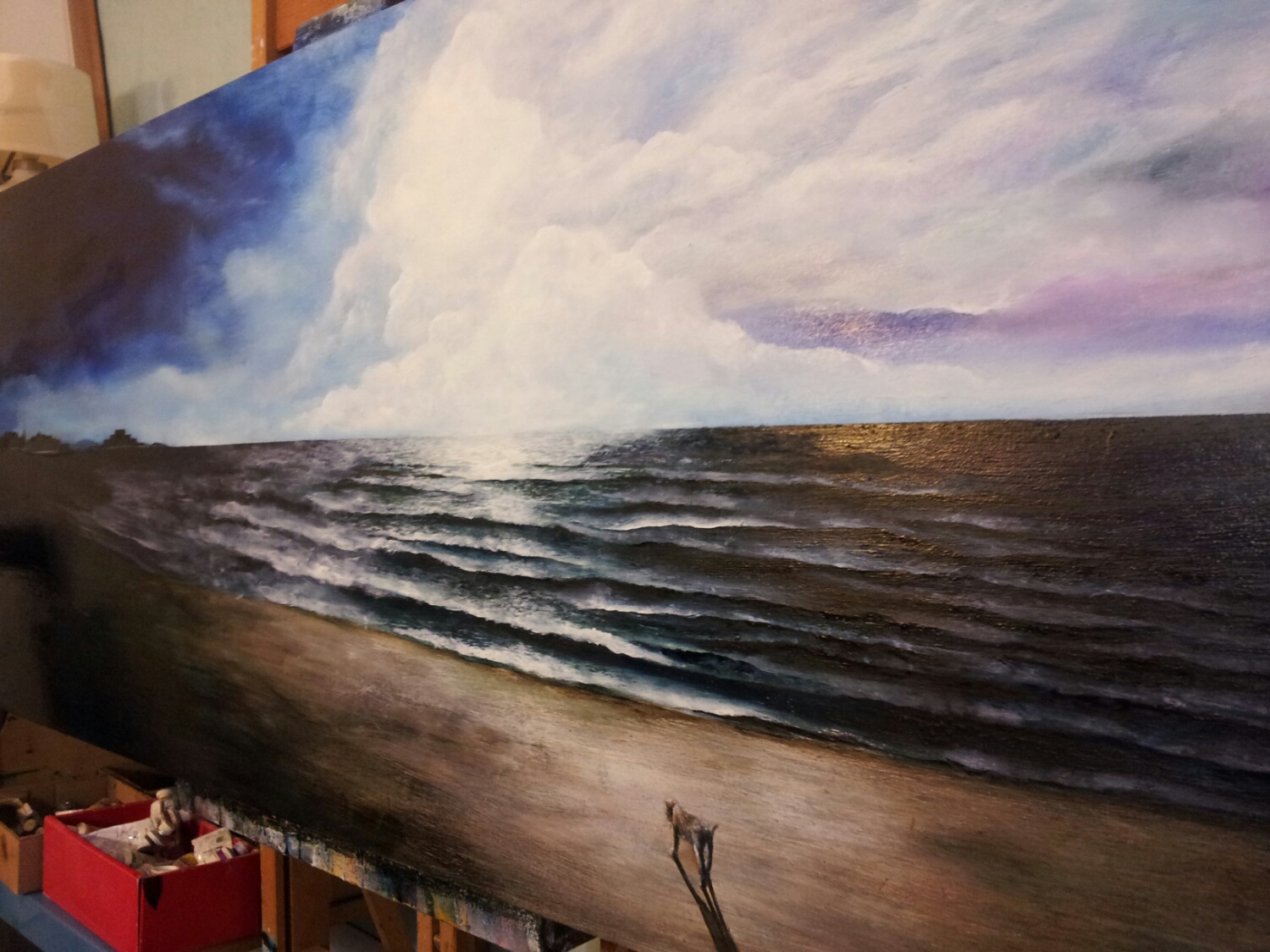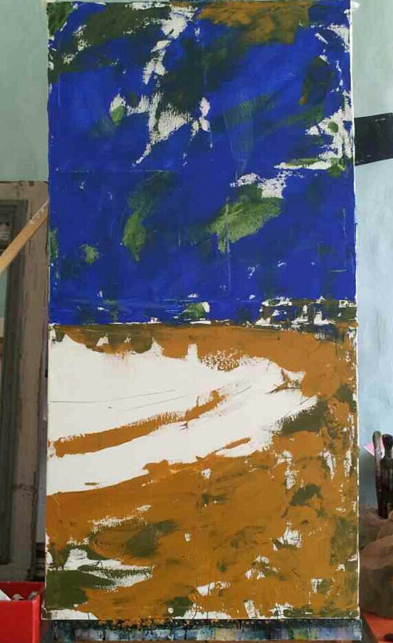 割愛しますが、ある事件があり 1週間ほど東京へ帰りました。 その後予定されてた どうしてもずらせない会議の為、 パリへ戻った直後、 ミュンヘン、デュッセルドルフと 移動しプレゼンを行い、 会議三昧の先週を過ごし今に 至ります。 毎回お侘びしてますが今回もまた、 ご心配をお掛けいたしました。 細かい事は全て来週! 仕事はやめ! 金曜夜からキャンバスの木枠を 作って布張って、今朝から早速 次の海の作品開始。 まずは早朝下描き。 頭がおかしくなったワケでは ありません。(笑) 考えながら描いています。 夕方から再開。 空がなかなか決まらずに失速。 ヘトヘト&絵の具も乾かないということで今夜はここまで。 疲れました…(笑)
