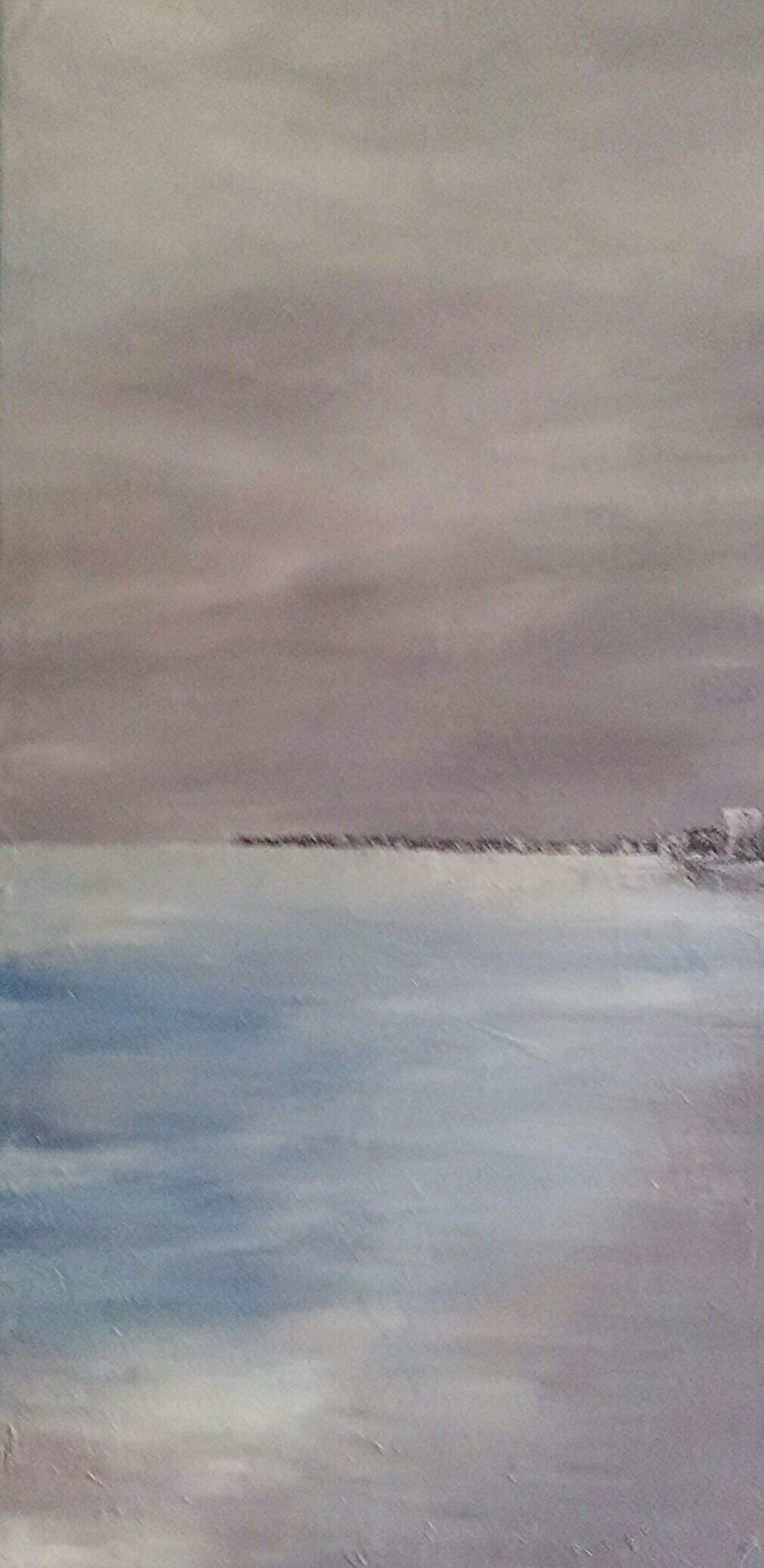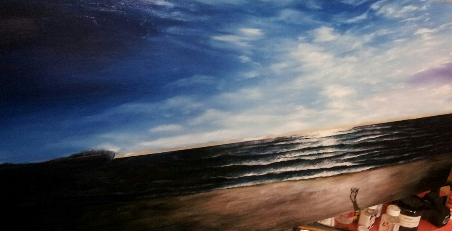 (特にEE22932さま) 実は、先日仕上げた?と言う 半端な宣言をした作品でしたが 画面がどうしても二分化された 印象が気になっていました。 元々、こう表現したかったのですが あまりにも二極化が著しいかなと。 違う風景が繋がって見えるような。 そこで、 空にもっと空気と風をもたせ 波も全体に広げ左右の世界を繋げ なんと無くですが全体の調和を 持たせ始めました。 心身共に最近、ほとほと疲れて いましたが、開き直り自分の 殻に閉じ込もってみました。 ダメなものはダメ。 良い事は良いと、半ば諦める事で 自分に素直になれる自分や 出来上がった作品は二度と見返さない自分に新しい気付きを与えた?!かも知れません。 この作品が優れているかどうか では無くて、前より今、 今より次へと踏みしめながら 進んでいけるか、が大切なのか、も。 ここ数日。 キャンバスに向かう時間、 少しの間ですが 静かな時間を過ごせています☆